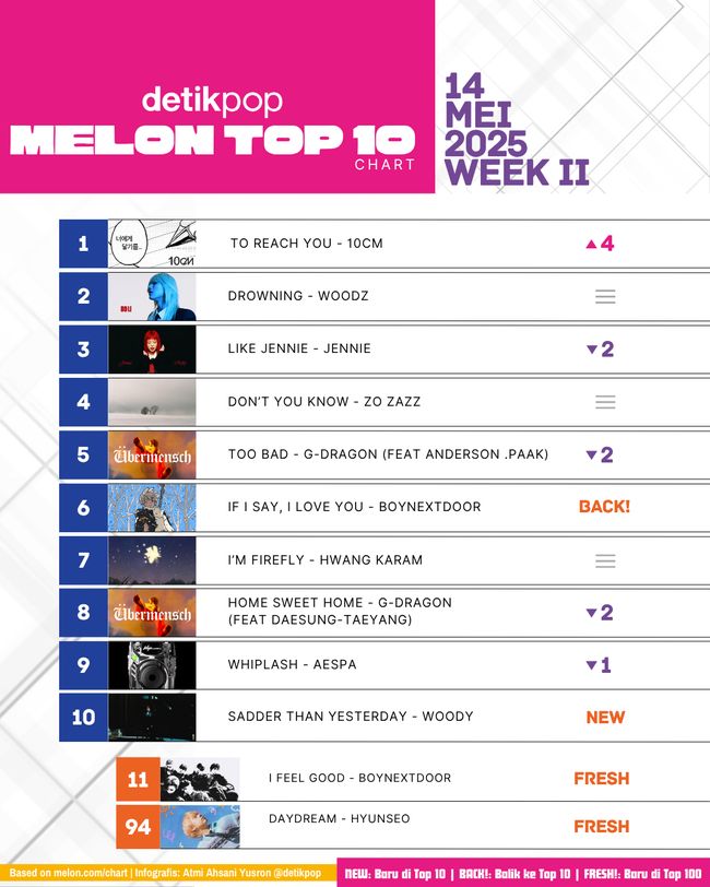 Jakarta - Update 10 lagu teratas di chart musik Korea Selatan! Setelah pekan lalu 'like JENNIE' jadi ratu chart Melon, kini posisi puncak diambil alih oleh 10CM. Selengkapnya dalam infografis di atas.