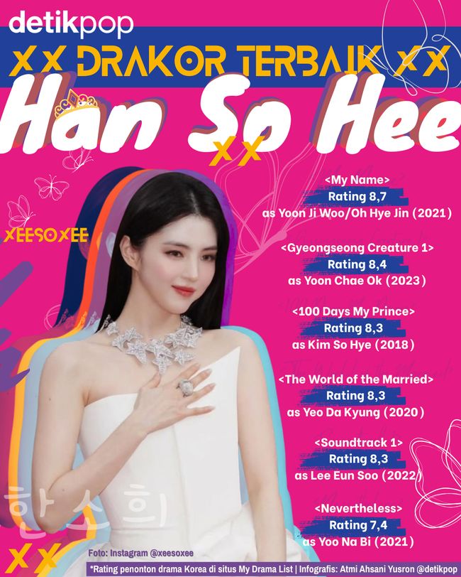 Jakarta - Sepanjang kariernya di industri entertainment Korea Selatan, Han So Hee udah banyak tampil di serial TV baik sebagai pemeran utama atau pemeran pendukung. Makin dikenal pecinta drakor Indonesia berkat The World of the Married, Han So Hee juga main di sederet judul populer. Selengkapnya dalam infografis di atas!