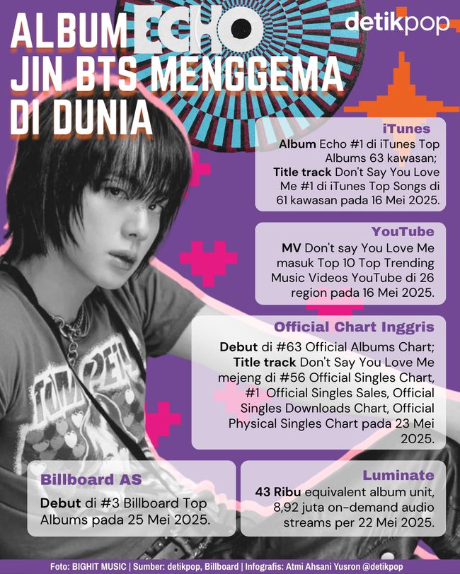 Jakarta - Jin BTS merilis album mini kedua berjudul Echo yang disambut meriah oleh ARMY di seluruh dunia. Terbukti dari pencapaian album ini di berbagai chart termasuk Billboard AS dan Official Chart Inggris. Simak catatan prestasi album Echo Jin BTS dalam infografis di atas.