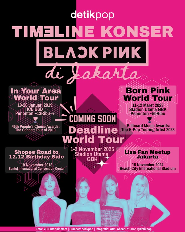 Jakarta - BLACKPINK pernah beberapa kali ke Jakarta untuk menyapa langsung para BLINK Indonesia. Jelang konser Deadline yang dijadwalkan 1-2 November 2025 mendatang, lihat lagi yuk timeline konser BLACKPINK di Jakarta selama ini!