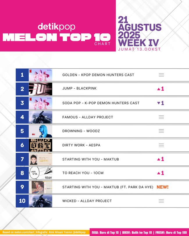Jakarta - Saja Boys minggir dulu ya, BLACKPINK mau ambil alih posisi #2! Chart Melon Top 10 pekan ini masih dikuasai oleh HUNTR/X dari OST K-Pop Demon Hunters dengan lagu Golden. BLACKPINK nunjukkin performa oke pekan ini dengan JUMP naik satu tangga dari peringkat minggu lalu. Selengkapnya di infografis!