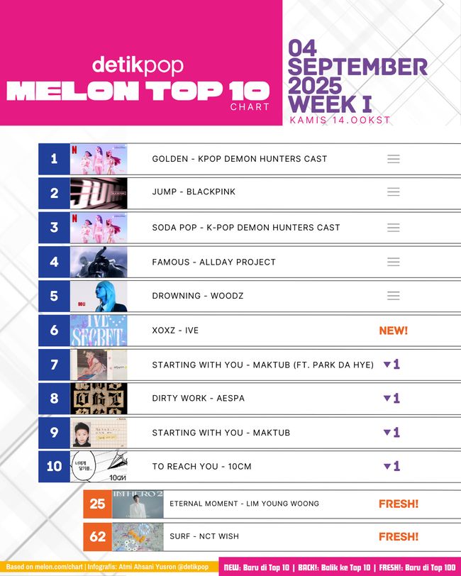 Jakarta - IVE comeback dengan album terbaru IVE SECRET pada 25 Agustus. Title track dari album ini, XOXZ, debut di posisi #18 chart Melon Top 100 pekan lalu dan meroket ke #6 pekan ini dilihat Kamis (4/9/2025). IVE jadi satu-satunya pendatang baru di Top 10! Pendatang baru pekan ini termasuk semua lagu dari album baru Lim Young Woong berjudul IM HERO 2 yang mendominasi 100 besar, dan NCT WISH dengan lagu Surf di posisi #62.