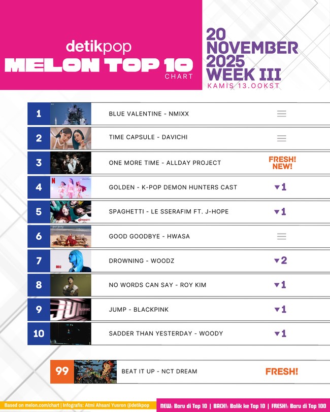 Jakarta - Teddy Park ngebuktiin lagi kalau dia emang hit maker luar biasa. Lagu baru grup co-ed ALLDAY PROJECT, ONE MORE TIME, baru rilis 3 hari lalu sekarang udah nangkring di posisi teratas chart Melon Top 100 aja nih! Pada Kamis (20/11/2025) ONE MORE TIME nendang Soda Pop dari OST K-Pop Demon Hunters di posisi 10 besar. Selengkapnya di infografis.