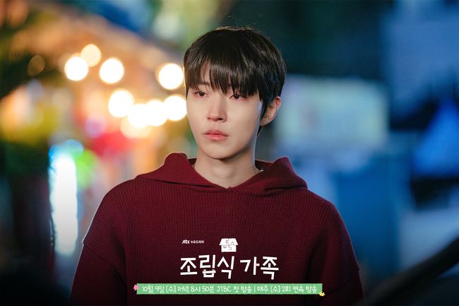 Di satu foto, Hwang In Youp yang memerankan karakter bernama Kim San Ha itu terlihat memberikan tatapan sedih ke lawan bicaranya. Rambutnya ditata rapi dengan poni menutupi alis. Dia pakai sweatshirt rajutan warna merah.