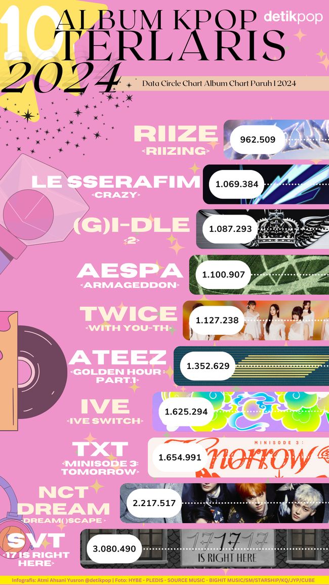 Tahun 2024 ini hanya ada 20 album fisik yang menembus penjualan 1 juta kopi. Lebih rendah dari tahun lalu dengan total 33 album fisik.