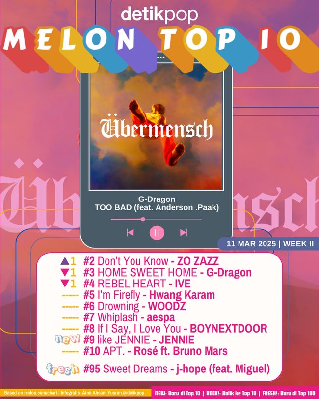 Jennie bersaing ketat dengan Rosé yang masih eksis dengan APT. Melihat sambutan pendengar musik domestik buat single Mantra yang dirilis tahun lalu, 'like JENNIE' punya potensi besar buat naik ke posisi tinggi, meski saingannya cukup berat sih: G-Dragon.