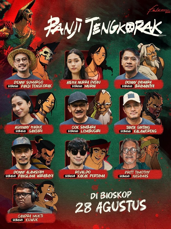 Film animasi Panji Tengkorak yang bakal tayang pada 28 Agustus 2025 di bioskop Indonesia sudah merilis trailer perdananya. Kini, Falcon Pictures merilis deretan nama aktor dan aktris yang bakal jadi pengisi suara film animasi Panji Tengkorak.