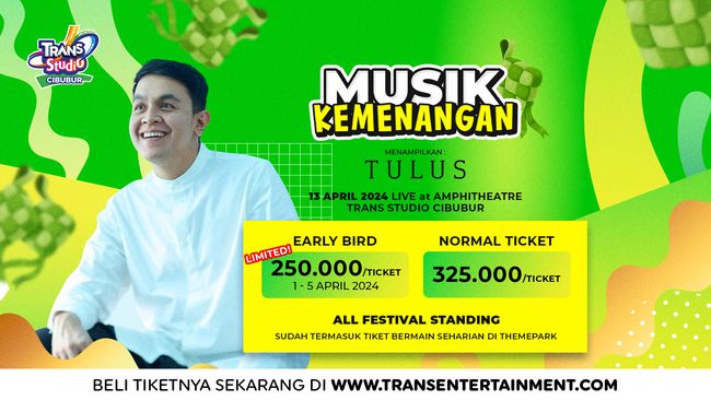 Main-main di Trans Studio Cibubur sambil nonton Musik Kemenangan yang menampilkan Tulus yuk! Datang Sabtu, 13 April 2024 dengan beli tiket dulu di www.transentertainment.com. Promo terbatas tiket early bird hanya Rp 250 ribu saja.