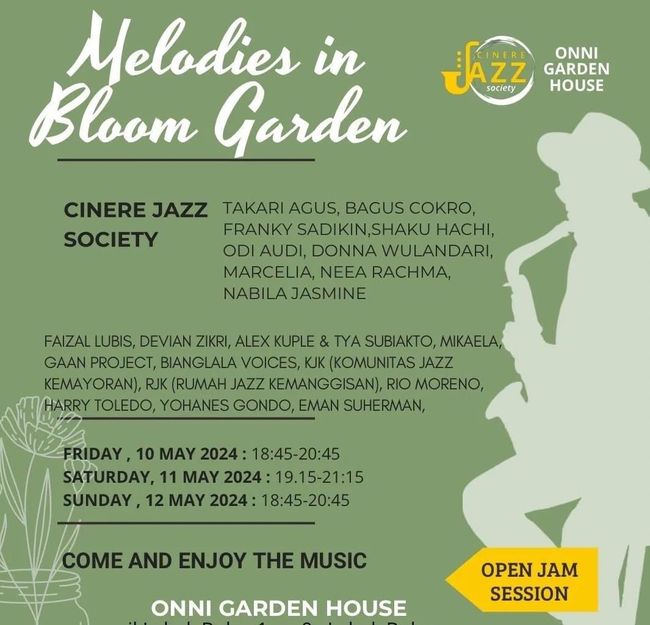 Cinere Jazz Society akan memeriahkan Grand Opening ONNI Garden House di Lebak Bulus, Jakarta, selama 3 hari berturut-turut, yaitu 10 hingga 12 Mei 2024.