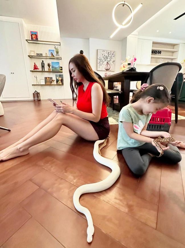 Arabella tampak memangku ular berwarna kuning. Bahkan ada foto yang memperlihatkan Arabella memakai ular tersebut seolah seperti hiasan kepala.