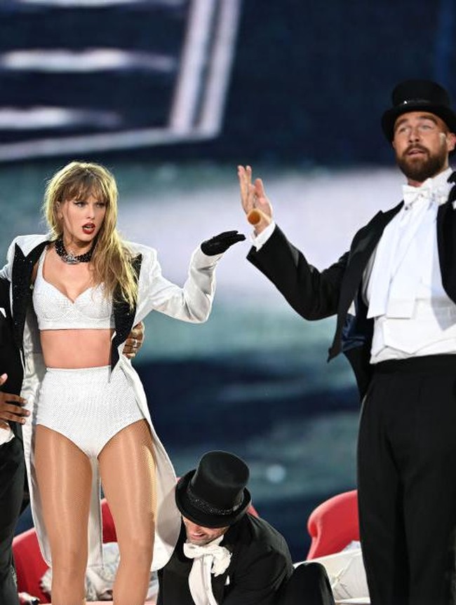 Akhirnya, Kelce jadi salah satu penari latar yang muncul pas transisi lagu "I Can Do It With a Broken Heart". Dia pake setelan tuksedo lengkap, jas dan celana hitam, plus topi tinggi.