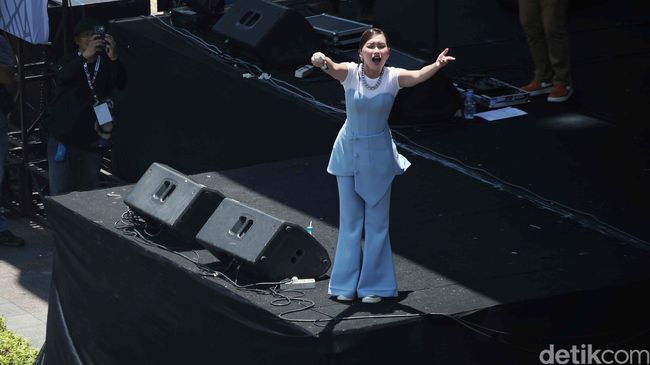 Penampilan ibu satu anak itu sukses menghipnotis penonton yang memadati Bundaran HI. Tak hanya dari suaranya, namun goyangan ngebornya sukses membuat penonton ikut bergoyang.