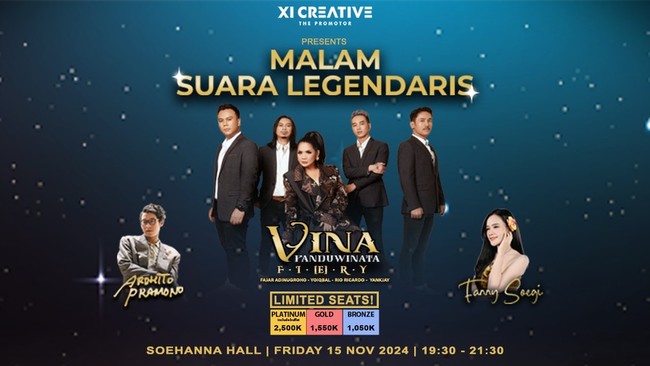 Vina Panduwinata siap menghadirkan momen spesial bagi para penggemarnya dalam konser intimate yang bertajuk Malam Suara Legendaris.