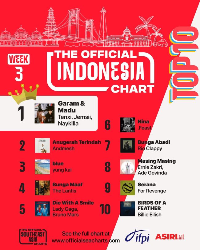 Adapun Official Indonesia Chart ini menggabungkan streaming dari platform global Apple Music, Deezer, Spotify, YouTube, dan Langit Musik. Tangga lagu ini dikelola oleh IFPI dan dibuat berdasarkan data yang disiapkan oleh BMAT, sesuai dengan prinsip dan metodologi tangga lagu global IFPI.