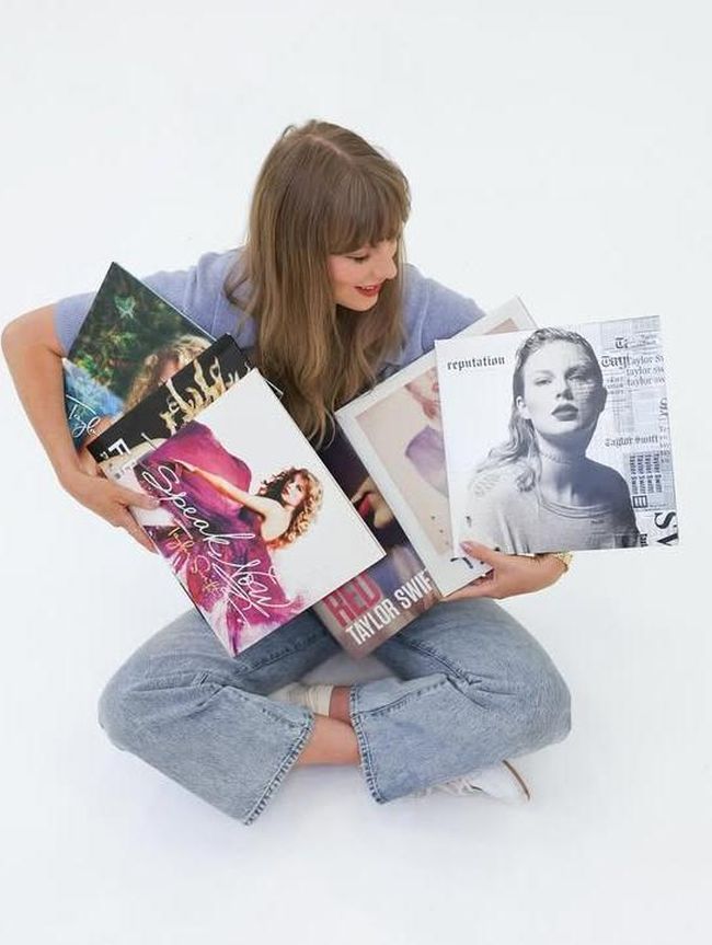 Di hadapannya ada semua sampul album yang pernah dirilis di bawah label BIG MACHINE yang dibeli Scooter Braun: Taylor Swift, Fearless, Speak Up, Red, 1989, dan Reputation. Semua album ini (kecuali Reputation) sebelumnya udah dirilis ulang dalam versi re-recording yang dicap sebagai Taylor's Version.