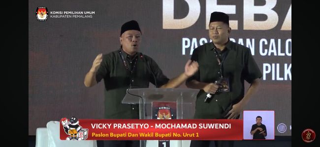 Vicky Prasetyo maju jadi Calon Bupati Pemalang dengan nomor urut 1 bareng Mochamad Suwendi. Malam ini, debat publik pasangan Calon Bupati dan Wakil Bupati Pemalang digelar hari ini dan juga ditayangkan secara live streaming lewat YouTube KPU Pemalang, Jawa Tengah.
