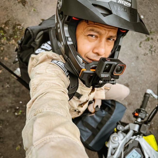 Dalam unggahan di akun Instagram pribadinya, Ariel tampak menggendong satu tas ransel di punggungnya dan ada satu tas lagi ada di bagian depan motornya.