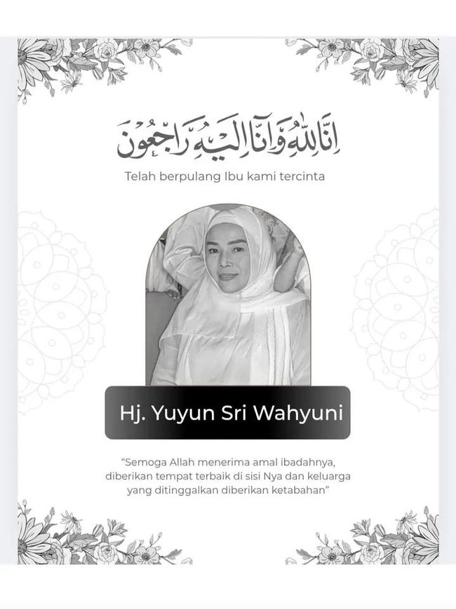 "Telah berpulang ibu kami tercinta Hj. Yuyun Sri Wahyuni. Semoga Allah menerima amal ibadahnya, diberikan tempat terbaik di sisiNya dan keluarga yang ditinggalkan diberikan ketabahan," tulis pihak keluarga dilihat detikcom, Minggu (13/7/2025).