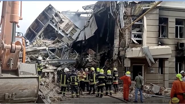 Namun terlihat pada gambar yang dilaporkan Reuters, gedung tersebut hancur berantakan separuh. Nampak sejumlah petugas pemadam kebakaran berada di lokasi.