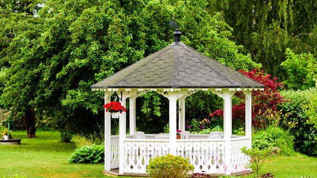 Gazebo juga bisa terbuat dari bahan PVC (polyvinyl chloride). Warna putihnya memberikan kesan yang lebih bersih dan memberi aksen warna di taman yang dominan berwarna hijau. Kamu juga bisa meletakkan kursi putih sebagai furnitur tambahan. Tak lupa, bunga merah yang digantung dan ditempatkan di atas meja juga menambahkan titik fokus bagi yang memandangnya.