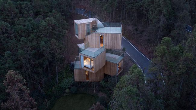 Walau disebut rumah pohon, tapi rumah ini tidak dibangun di atas pohon. Melainkan rumah Qiyunshan ini berdiri setinggi 11 meter di sekitar hutan cedar merah di Anhui timur, Tiongkok.