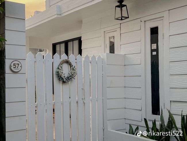Rumah milik Rikka Rafka tersebut ditutupi dengan pagar kayu berwarna putih. Dari gerbang tersebut, sisa lahan rumahnya dibuat taman kecil. Di ujung taman dibuat tempat duduk dari beton yang didekorasi serba putih dan ada sentuhan warna hijau dari tanaman kaktus di belakangnya. Area tersebut dibuat terbuka tanpa kanopi.