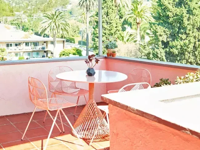 Poin penting saat mendekorasi ruang kecil adalah mengurangi keberadaan barang. Jika kamu ingin ada kursi, kamu bisa menyiasati mejanya berada di atas dan menempel di dinding atau pagar teras. Selain dapat meletakkan barang-barang di atas sana, cara ini juga dapat menghemat tempat.
