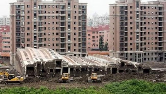 Seperti yang terjadi pada Lotus Riverside, sebuah apartemen di Shanghai, China yang bernasib buruk. Bangunan apartemen itu baru saja dibangun tetapi tumbang seakan-akan baru saja didorong raksasa.