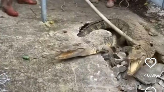 Ketika buaya itu meronta tidak ingin ditangkap petugas, seketika muncul buaya lainnya dari dalam jalan. Hal ini sontak membuat para warga kaget dan mengambil langkah mundur. Total, ada 3 buaya yang terlihat dari video tersebut.