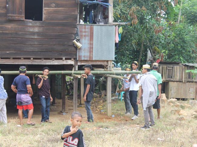 Tiang-tiang rumah yang akan diangkat harus dipasang bambu terlebih dahulu. Bambu-bambu itulah yang nantinya menjadi tempat pegangan untuk mengangkat rumah.