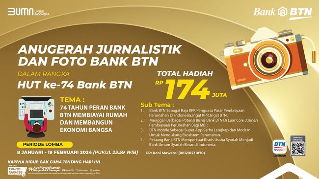PT Bank Tabungan Negara (Persero) Tbk kembali menggelar Anugerah Jurnalistik dan Foto BTN untuk menyemarakkan perayaan Hari Ulang Tahun ke-74. Ajang tersebut memberikan total hadiah senilai Rp 174 juta.