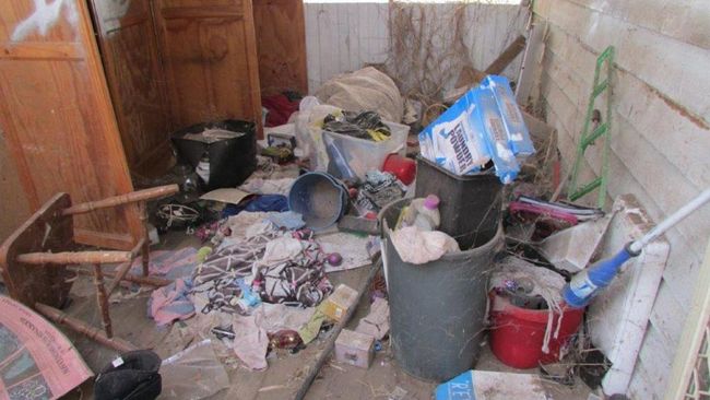 Foto-foto rumah tersebut memperlihatkan ruang tamu yang berantakan, kamar mandi yang terbongkar, dinding bata yang roboh, dan dapur yang dipenuhi piring kotor.