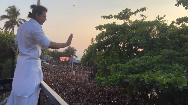 Dengan pakaian putih, Shah Rukh Khan menyapa penggemarnya yang memadati jalanan di sekitar rumahnya. Pagar rumah Shah Rukh Khan sampai ditahan oleh belasan polisi agar tidak roboh di dorong massa.