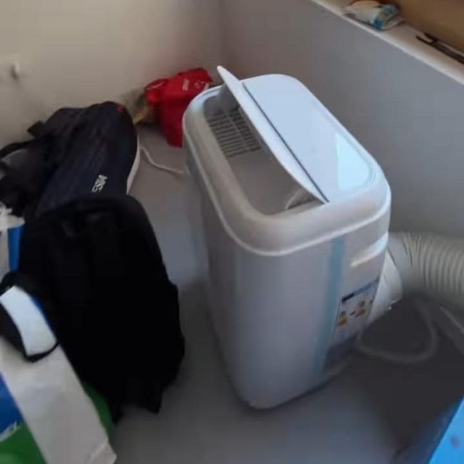 "Ini penutup biar udara tidak masuk ke dalam dan udara panasnya bisa keluar," kata pria yang memasangkan AC portable.