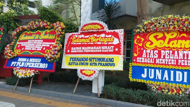 "Selamat Bertugas Bapak Maruarar Sirait Menteri Perumahan Rakyat," tulis salah satu karangan bunga.