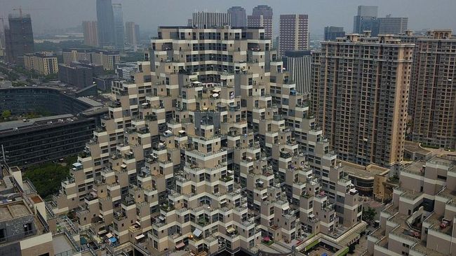 Apartemen 18 lantai di China sempat viral karena bentuknya yang tak biasanya. Pasalnya bangunan ini seperti tumpukan lego yang membentuk piramida. Bahkan kemiringan bangunan ini 45 derajat ke arah tengah.