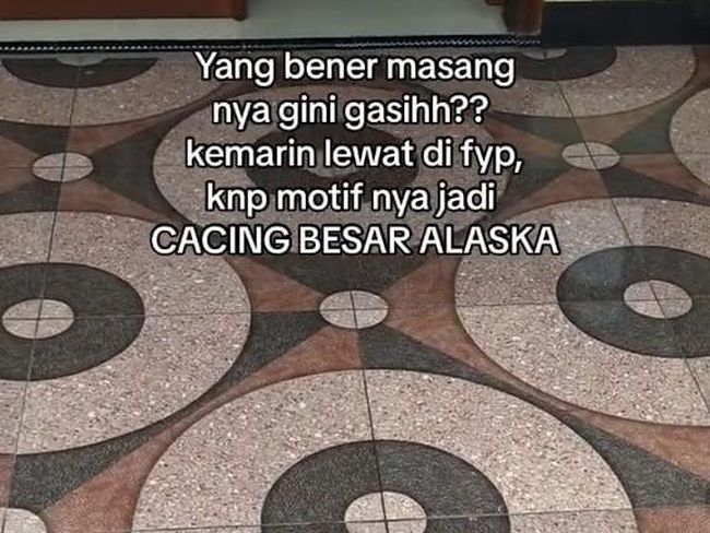 Sebuah video viral menunjukkan lantai yang salah pasang keramik. Akibat kesalahan itu motifnya disebut berbentuk seperti cacing besar Alaska. Seorang netizen pun ikut menunjukkan motif lantai yang serupa, tapi kali ini bukan berbentuk cacing.