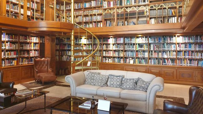Presiden ke-3 RI BJ Habibie semasa hidupnya membangun perpustakaan di Wisma Habibie & Ainun. Selain bernuansa Nusantara, elemen yang menarik perhatian adalah tangga melingkar dengan railing berwarna emas.