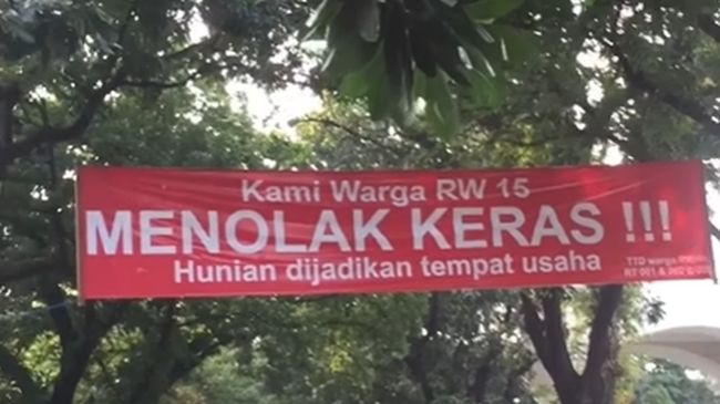 Berdasarkan video dari Instagram @jakartainpo, terlihat sebuah spanduk merah dengan tulisan 'Kami Warga RW 15 MENOLAK KERAS !!! Hunian dijadikan tempat usaha'. Spanduk itu dipasang di atas jalan dekat rumah besar berwarna putih.