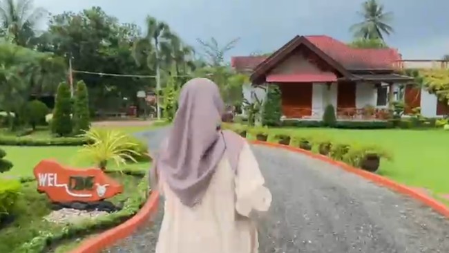 Dilihat dari TikTok @tzaltedcaramel, Namiya selaku pemilik akun membuka gerbang hijau besar. Memasuki halaman rumah, tampak jalan meliuk-liuk yang cukup luas sebagai akses kendaraan.