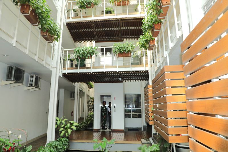 Bagian dalamnya banyak dipenuhi tanaman dalam pot dan material kayu, seperti pada lantai dan juga dinding. Rumah dengan cat putih itu tampak terdiri dari 3 lantai yang setiap lantainya dipenuhi tanaman.