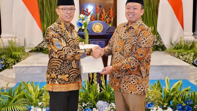 Menteri Agraria dan Tata Ruang/Kepala Badan Pertanahan Nasional (ATR/BPN) Nusron Wahid menyerahkan sertifikat hak pakai untuk aset milik Kementerian Luar Negeri (Kemenlu). Sertifikat diserahkan ke Menteri Luar Negeri Sugiono di Gedung Pancasila, Kementerian Luar Negeri, Jakarta Pusat, Kamis (6/11/2025).