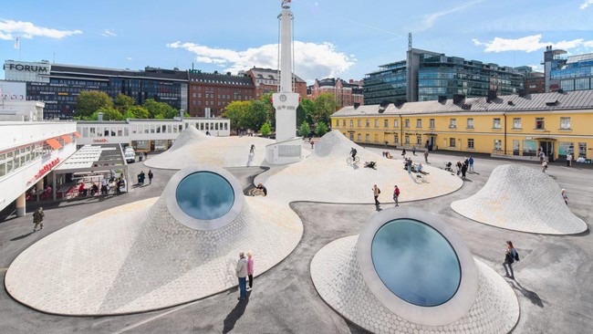 Bangunan bersejarah di Helsinki, Finlandia, Lasipalatsi direnovasi untuk dijadikan galeri bagi museum seni Amos Rex. Strukturnya tidak dapat diubah dan bangunan tak boleh diperluas. Maka dari itu, JKMM Architects memperluas bangunan di bawah halamannya.