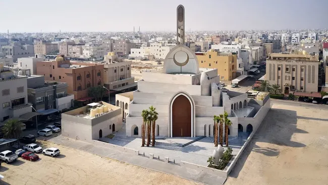 Masjid Mamluki Lancet dibangun oleh studio Babnimnim yang memadukan motif Islam klasik dengan bentuk kontemporer. Adapun, menara masjid ini memiliki tinggi 39 meter. Ruang salat utama masjid ini bisa menampung hingga 600 jamaah. Foto: Mohammed Alsaad and Nasser Alomairi via Dezeen