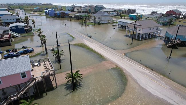 Pemandangan dari udara menunjukkan rumah-rumah yang terendam banjir setelah badai tropis Alberto menghantam Meksiko, di Surfside Beach, Texas, AS, pada 20 Juni 2024.