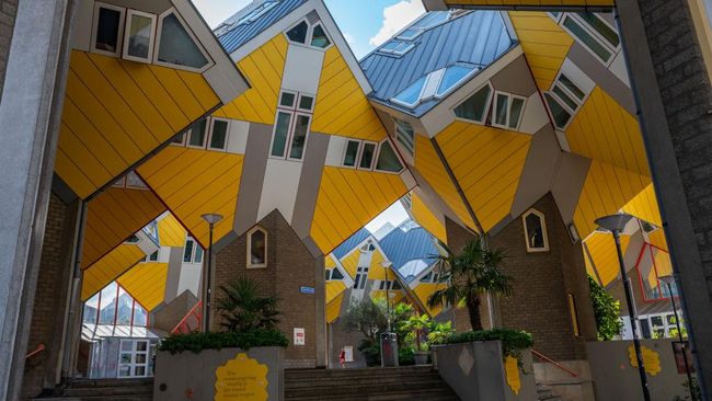 Cube House punya tema"Living as an urban roof" untuk mengoptimalkan ruangan di dalamnya. Bangunan beratapkan rumah dengan kemiringan 45 derajat ini berada di Rotterdam, Belanda. Jonathan Raa/NurPhoto via Getty Images