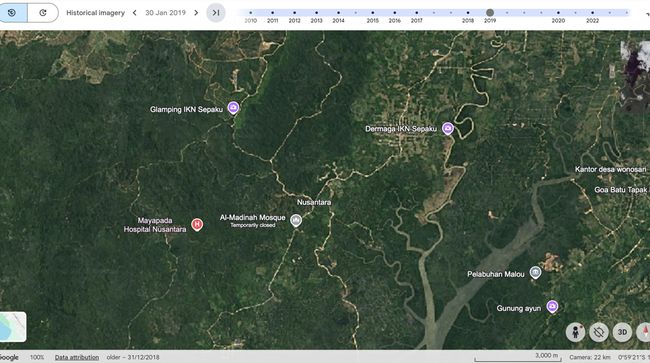 Berdasarkan catatan detikcom, pada 2019 Presiden ke-7 Indonesia Joko Widodo telah mengumumkan pusat administrasi negara akan dipindahkan ke Pulau Kalimantan. Lebih tepatnya, ibu kota negara dipindahkan ke Nusantara, yang terletak di Kabupaten Kutai Kertanegara dan Penajam Paser Utara, Kalimantan Timur. Foto: Tangkapan Layar via Google Earth