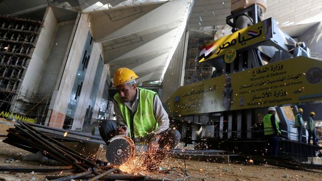 Foto arsip Januari 2018 menunjukkan pekerja konstruksi menyelesaikan pembangunan Museum Agung Mesir di Giza. Foto: REUTERS/Amr Abdallah Dalsh