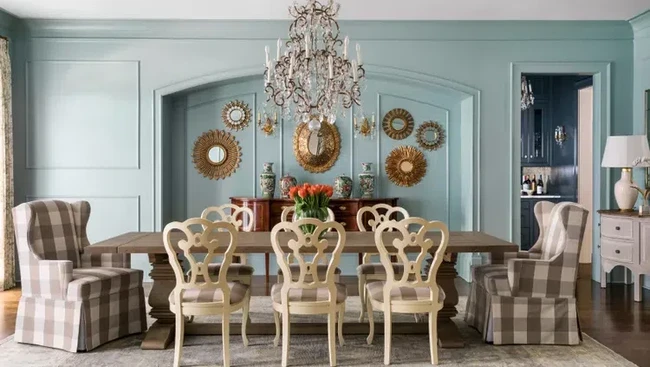 Ruang makan seperti ini bisa menjadi inspirasi desain interior ala Eropa. Dengan lampu gantung, meja panjang, bangku di semua sisi, dan paling penting adalah dindingnya yang dilapisi dengan wall panel sehingga membuat tampilan ruangannya klasik. Foto: MAGGIE GRIFFIN DESIGN, ROBERT PETERSON