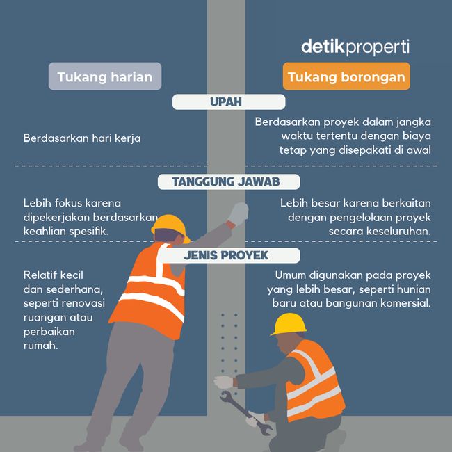 Memang apa sih perbedaan tukang harian dengan tukang borongan? Dikutip dari Instagram resmi Kementerian Pekerjaan Umum dan Perumahan Rakyat (PUPR), tukang harian adalah pekerja konstruksi yang dibayar per hari kerja. Pembayarannya dihitung dengan menjumlahkan hari kerja per orang pertugas.